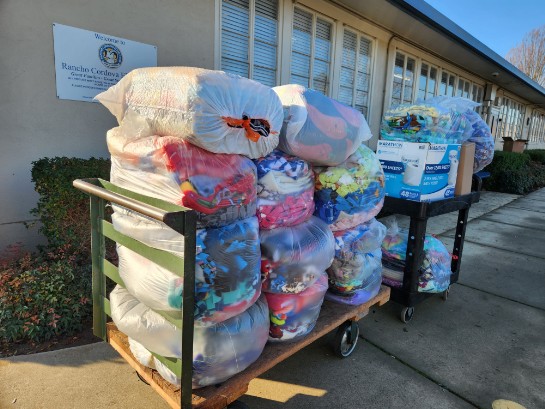We also have an annual Kindergarten Project. We collect Beanie Babies all year long and volunteers make double-fleece no-sew blankets. In the fall, we pick as many as we can of the lowest-income elementary schools in Sacramento/Placer County and find out how many kindergarteners they have. Before the winter holidays, we give EVERY kindergartener a warm double-fleece blanket and a Beanie Baby in a pouch.